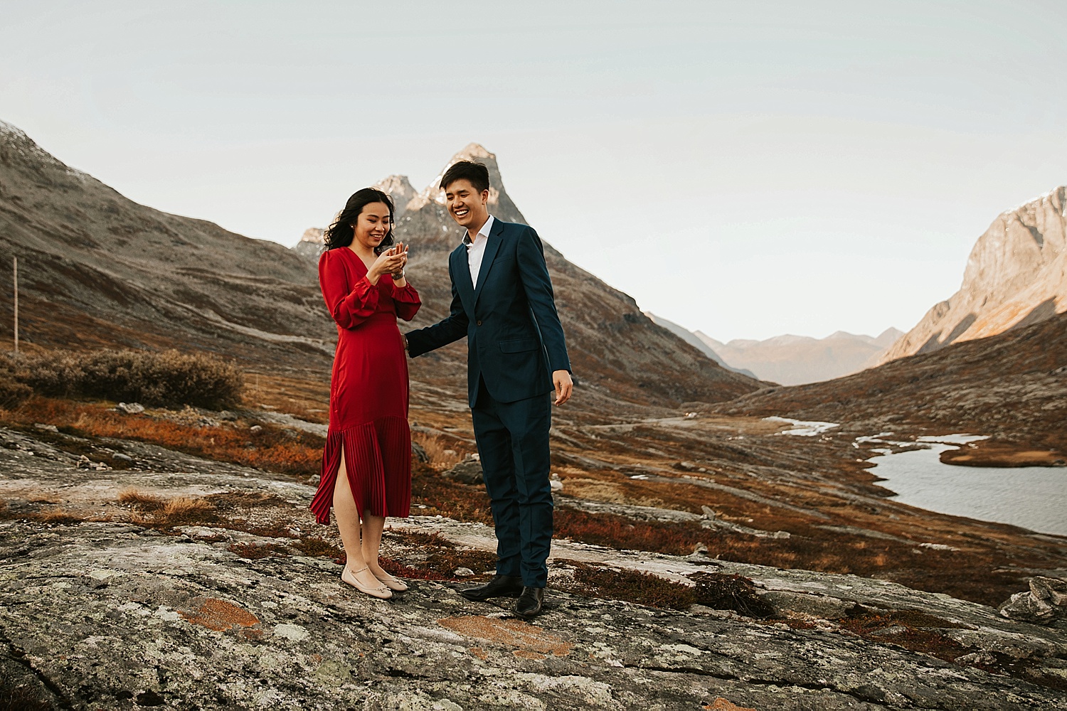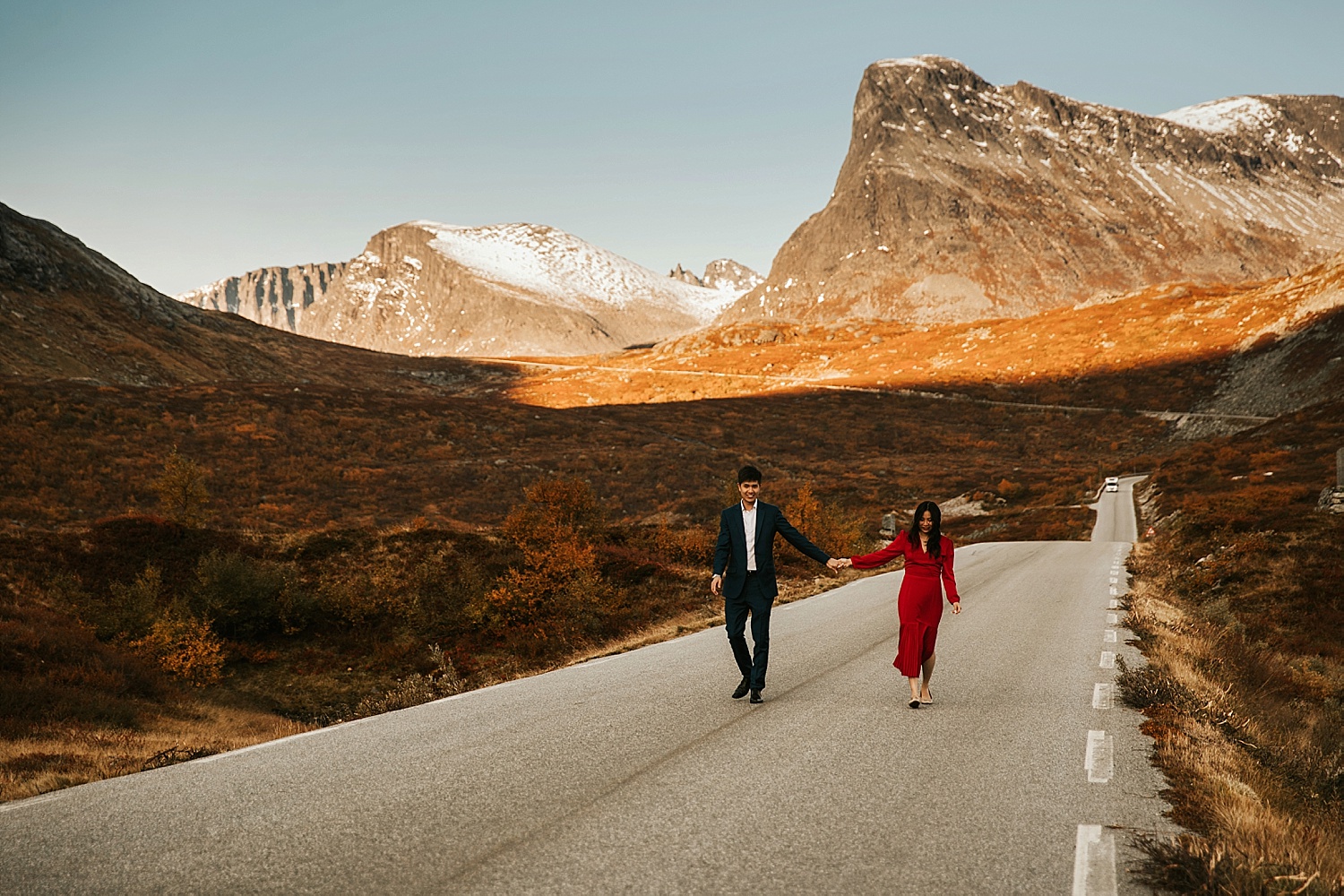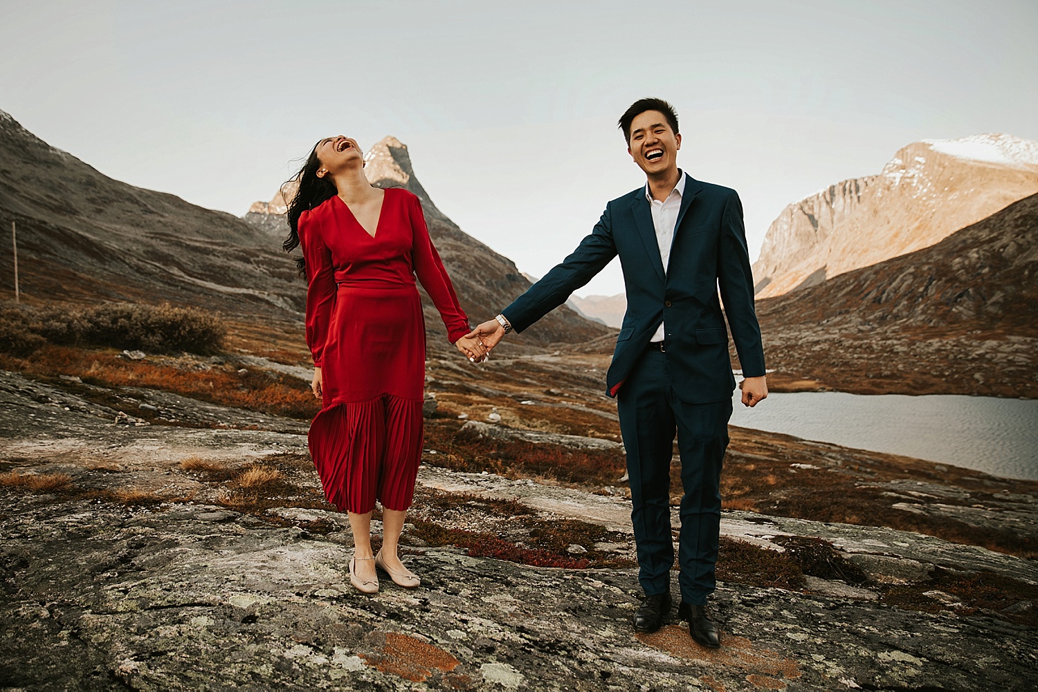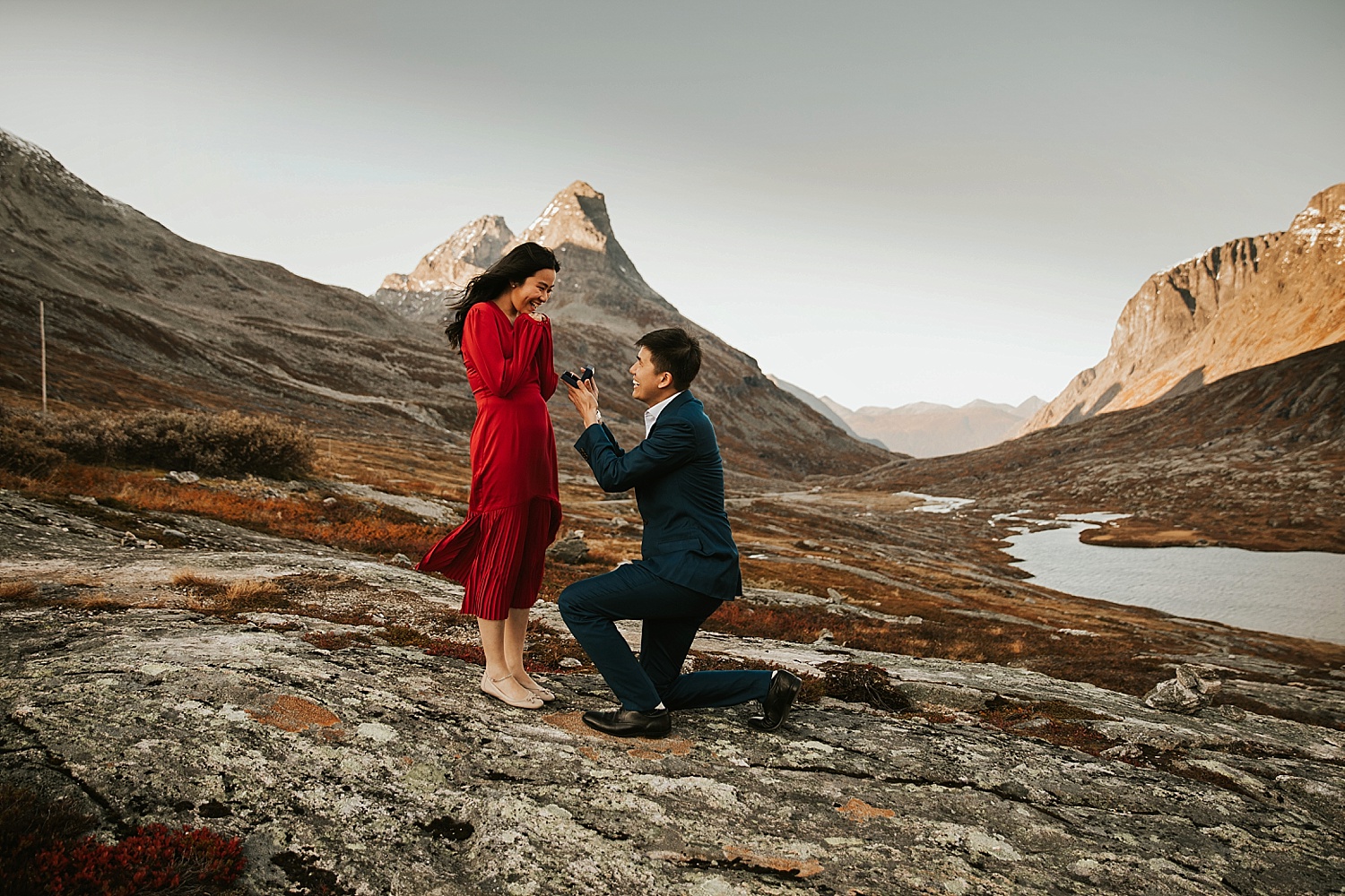 I was super excited when Evetor and Gawaine contacted me about doing a shoot during their trip to Norway! They came all the way from Singapore to the cold Norwegian mountains, dressed in beautiful fall colours. And you can only imagine that I got even more excited when Gawaine suddenly contacted me without Evetor knowing, and told me that he was planning to propose during the shoot, while I was there to capture the moment. So it’s safe to say that this was a shoot a bit out of the ordinary, and it was so special to be a part of! So scroll your way down to see Evetors reaction to the proposal, and enjoy these photos of two happy souls in the gorgeous mountainscapes of Romsdal and Valldal :)