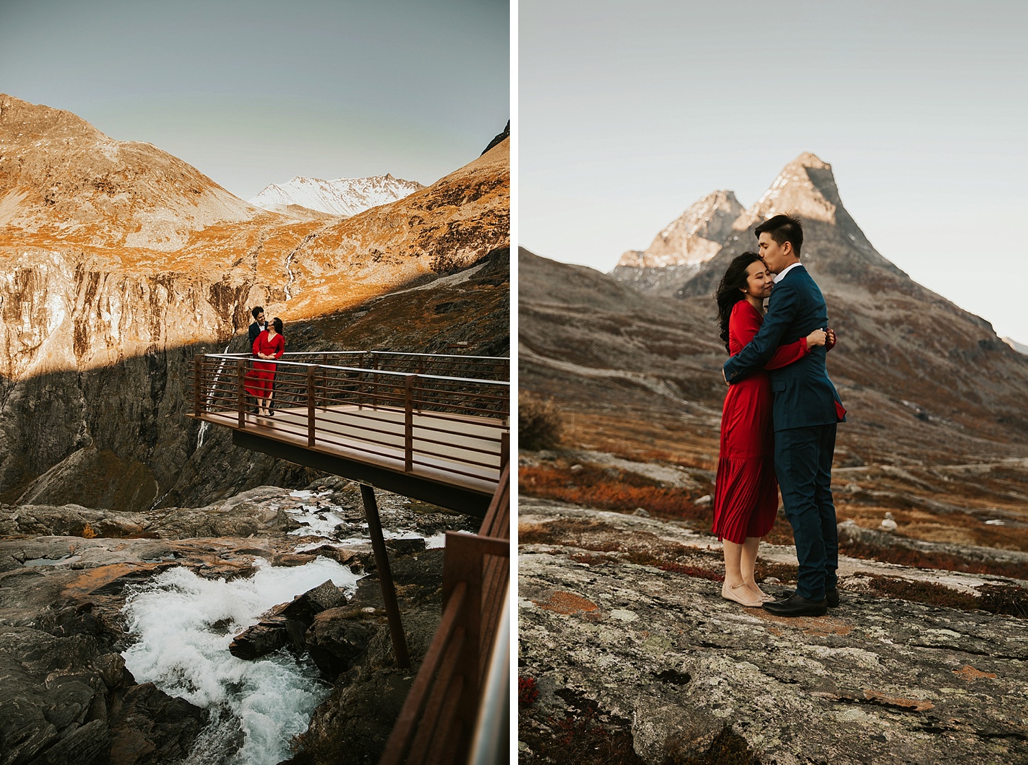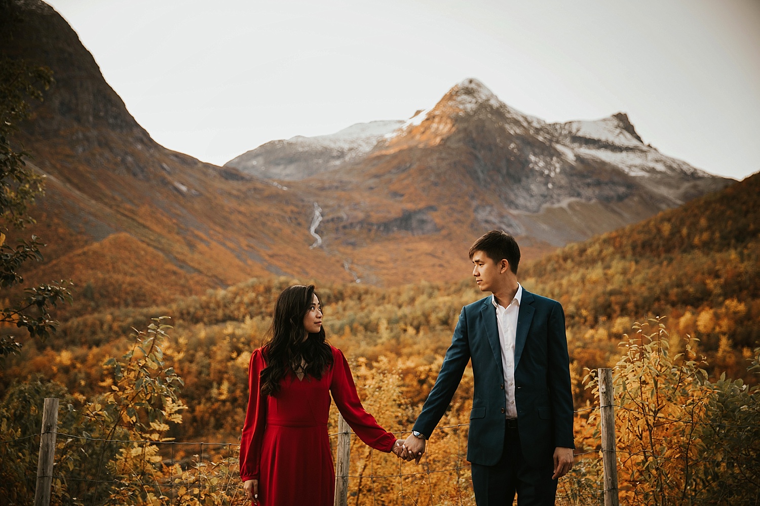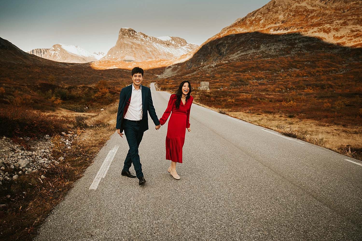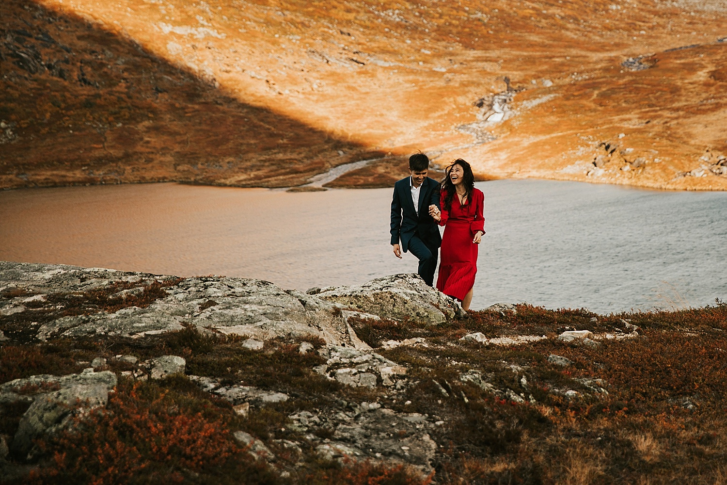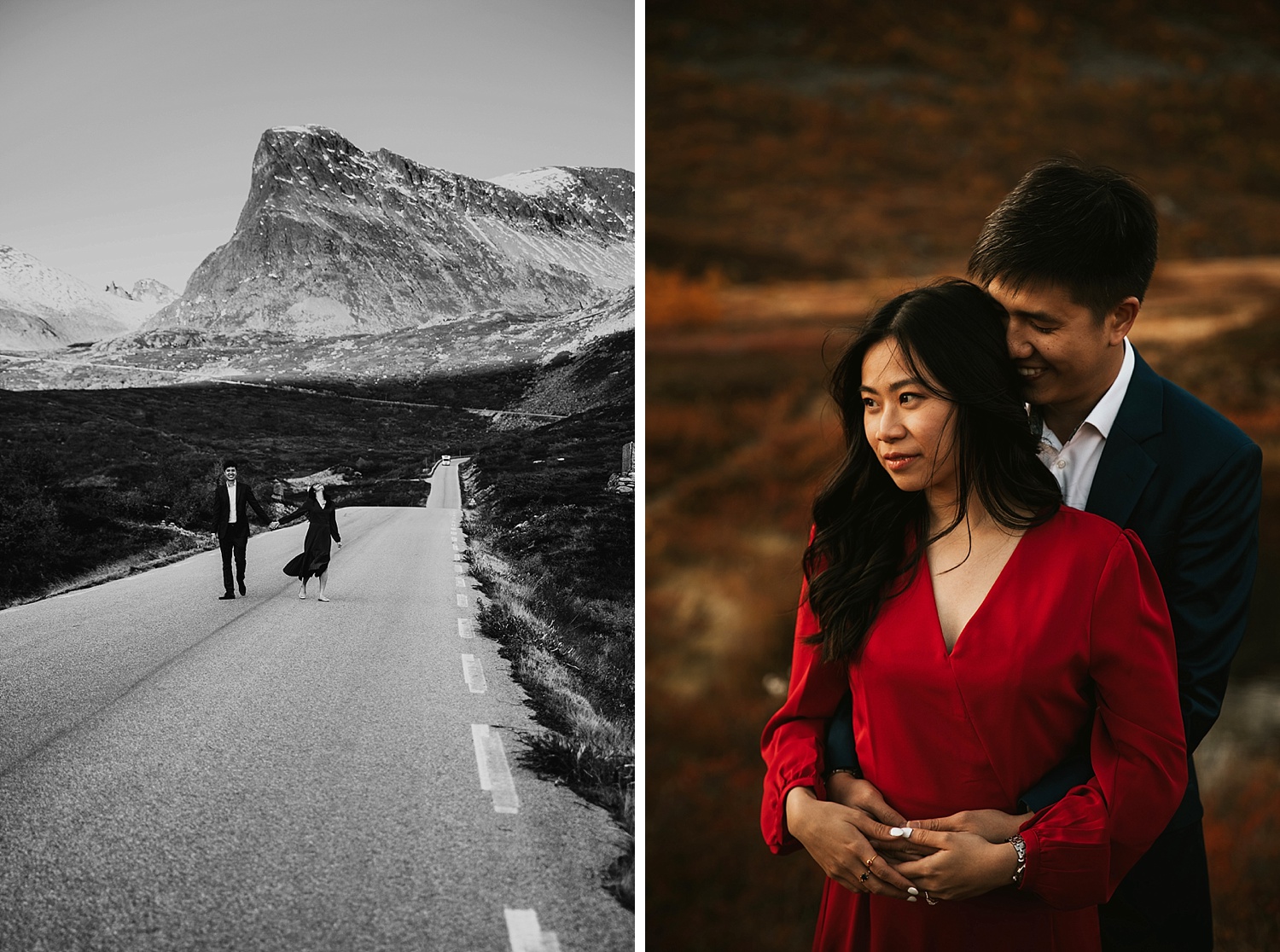 I was super excited when Evetor and Gawaine contacted me about doing a shoot during their trip to Norway! They came all the way from Singapore to the cold Norwegian mountains, dressed in beautiful fall colours. And you can only imagine that I got even more excited when Gawaine suddenly contacted me without Evetor knowing, and told me that he was planning to propose during the shoot, while I was there to capture the moment. So it’s safe to say that this was a shoot a bit out of the ordinary, and it was so special to be a part of! So scroll your way down to see Evetors reaction to the proposal, and enjoy these photos of two happy souls in the gorgeous mountainscapes of Romsdal and Valldal :)