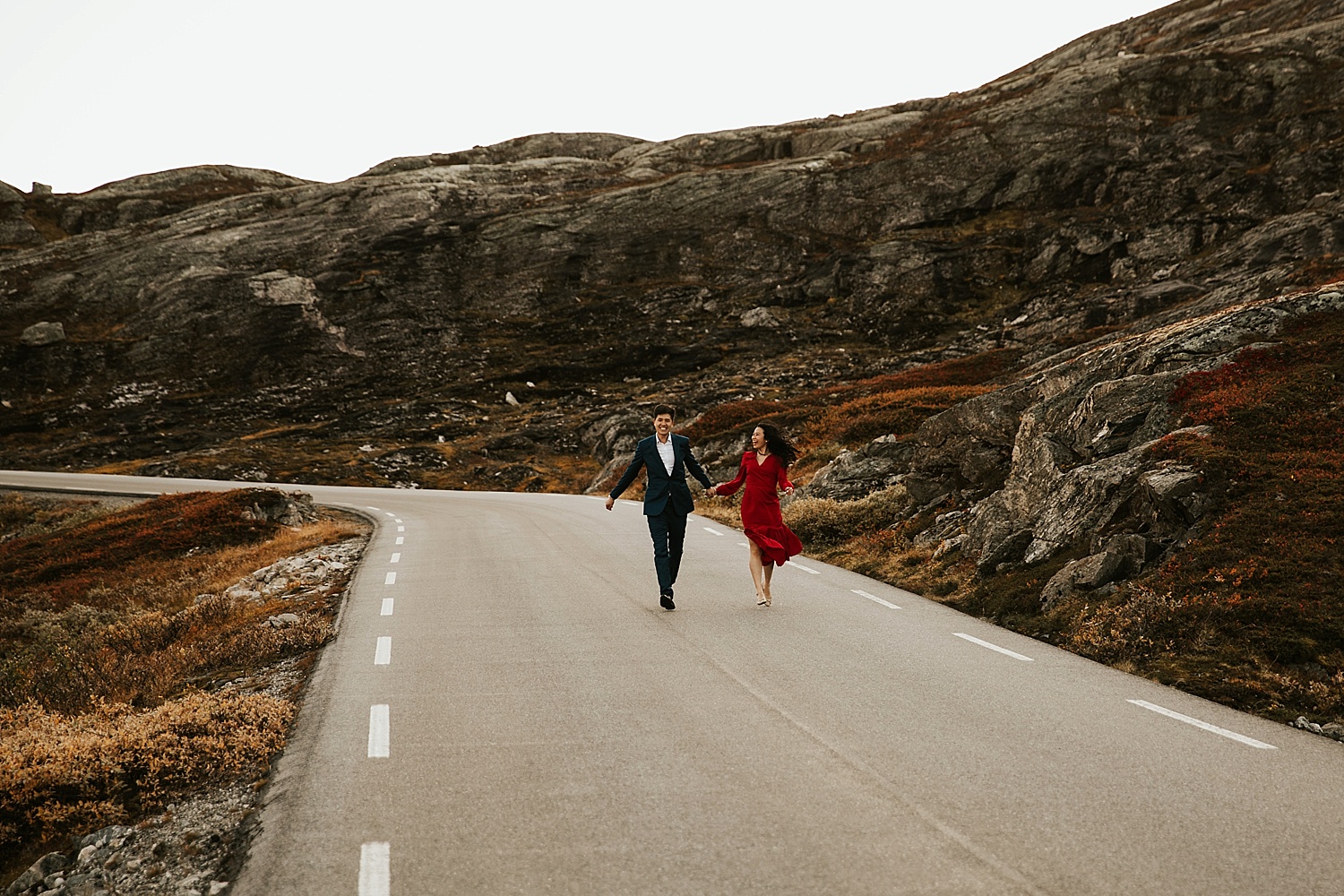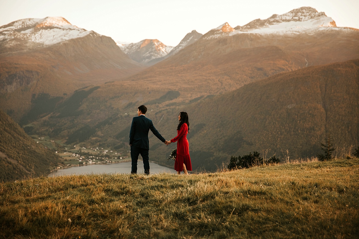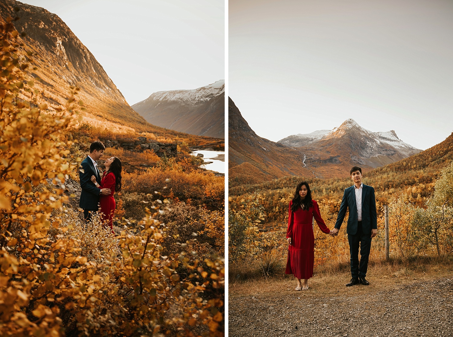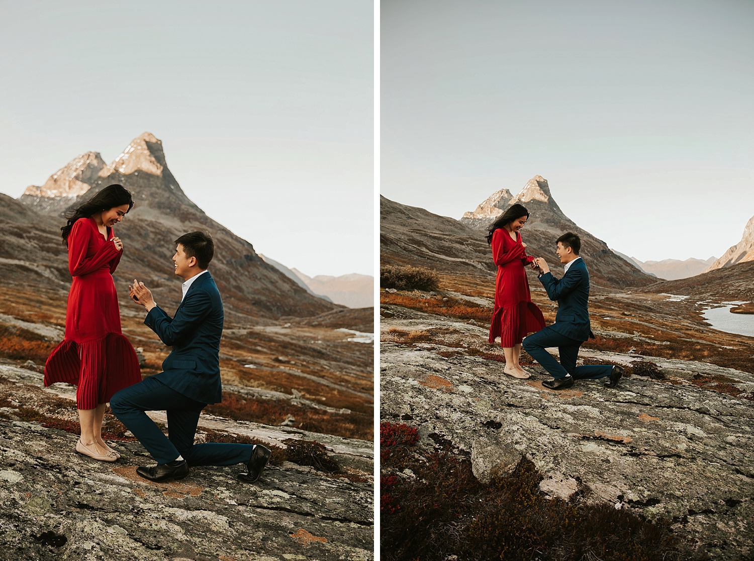 I was super excited when Evetor and Gawaine contacted me about doing a shoot during their trip to Norway! They came all the way from Singapore to the cold Norwegian mountains, dressed in beautiful fall colours. And you can only imagine that I got even more excited when Gawaine suddenly contacted me without Evetor knowing, and told me that he was planning to propose during the shoot, while I was there to capture the moment. So it’s safe to say that this was a shoot a bit out of the ordinary, and it was so special to be a part of! So scroll your way down to see Evetors reaction to the proposal, and enjoy these photos of two happy souls in the gorgeous mountainscapes of Romsdal and Valldal :)