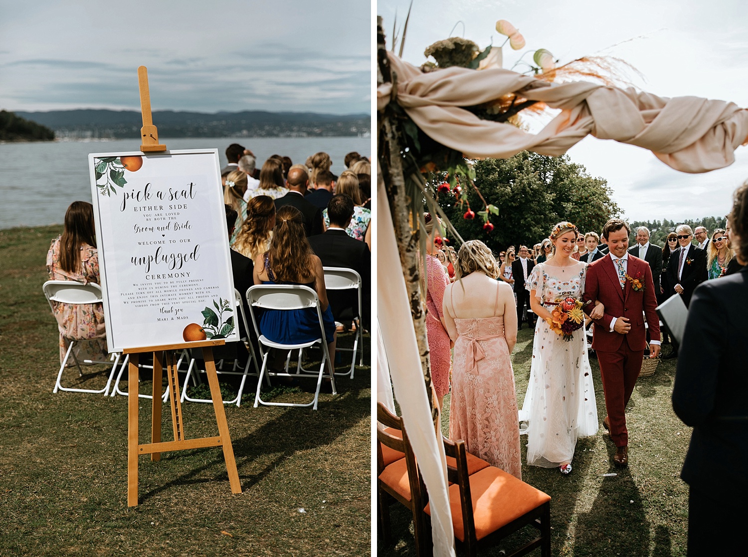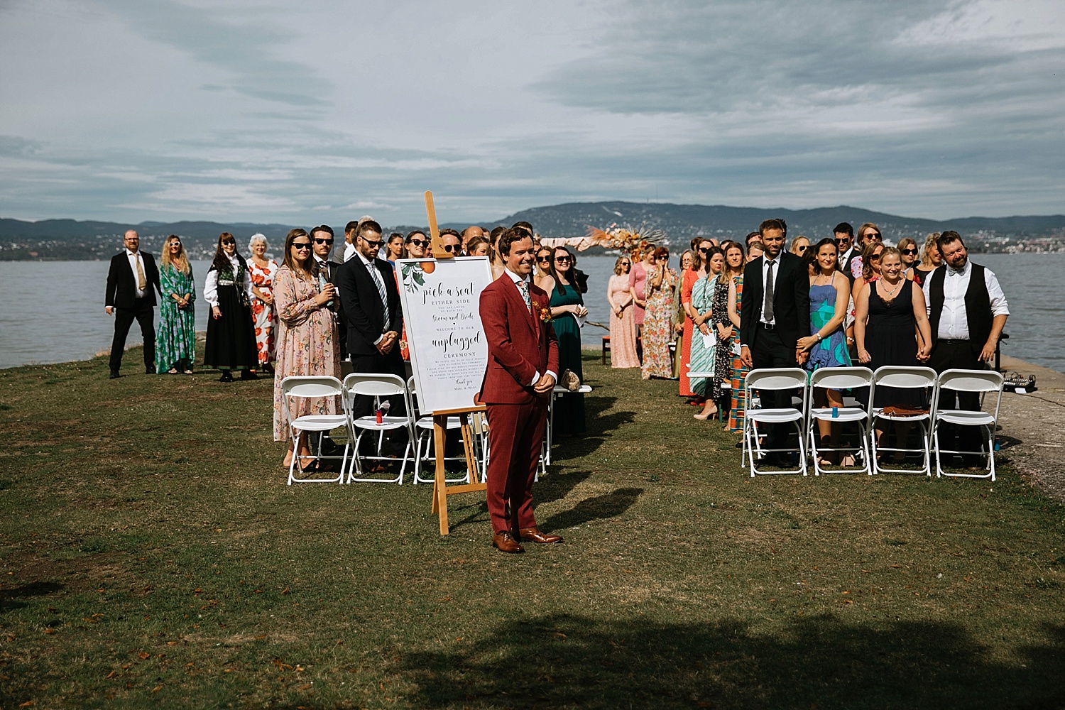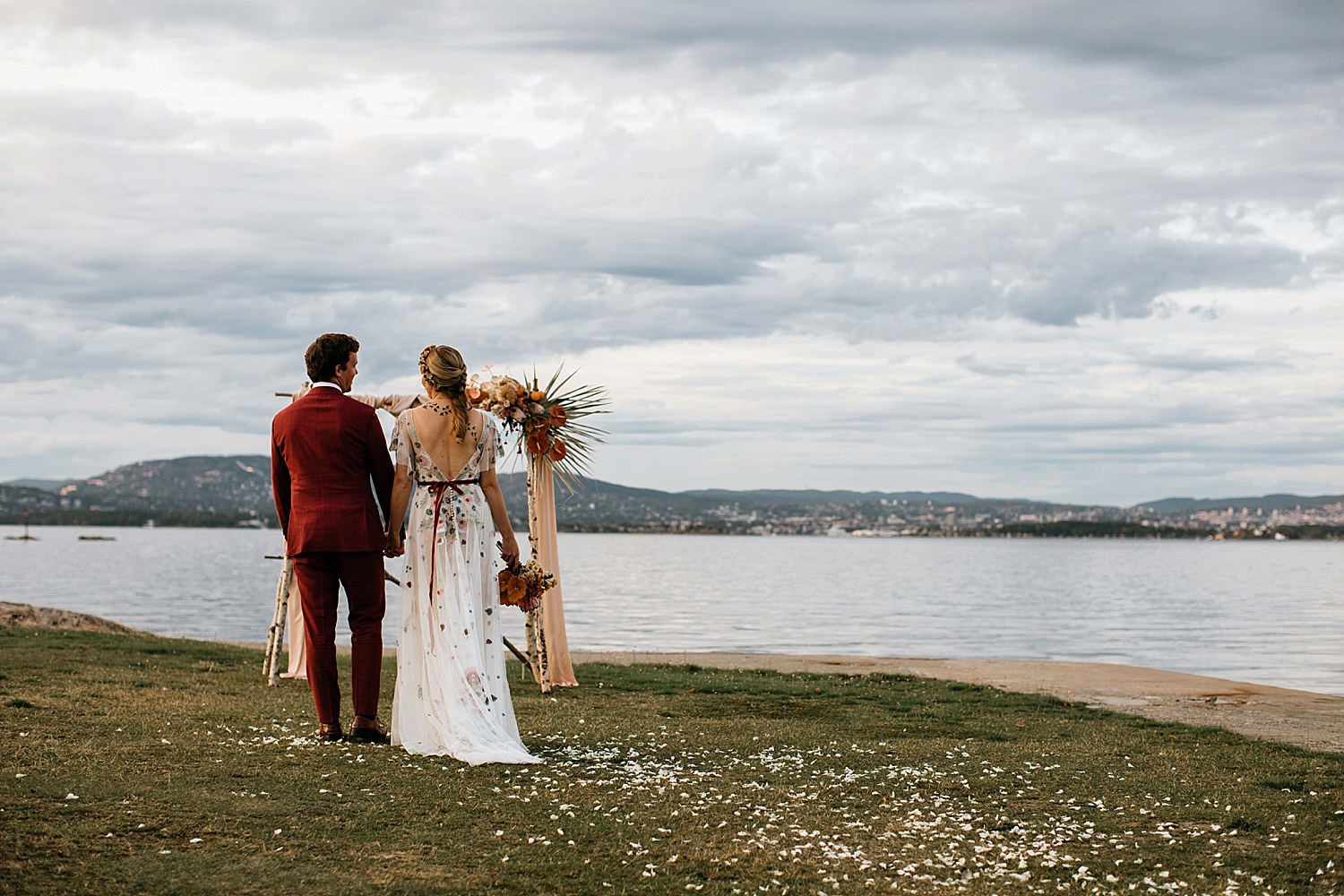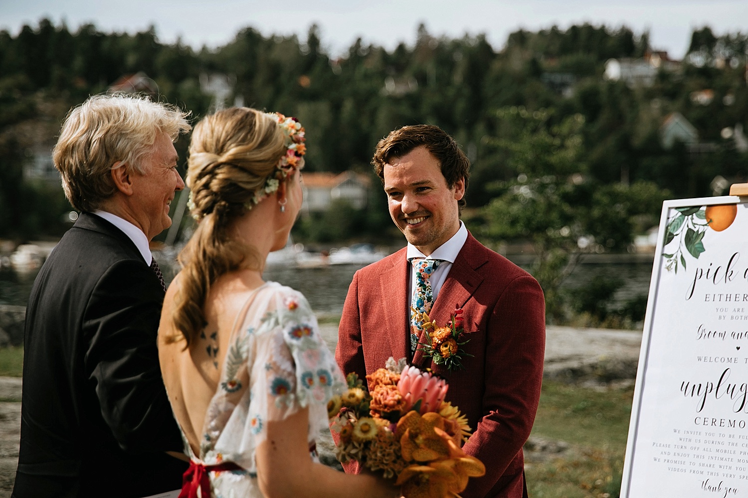 Kort fortalt, dagen opprant med strålende vær og det ble en perfekt start på dagen for mange av gjestene som tok båt fra Oslo. Hele dagen var en fest for øynene, med utradisjonelle valg både i farger, blomster og kjole og dress, og det var så gøy å se! Ingenting var overlatt til tilfeldighetene her, og Hellviktangen var den perfekte rammen rundt feiringen av Mari og Mads denne strålende augustdagen <3