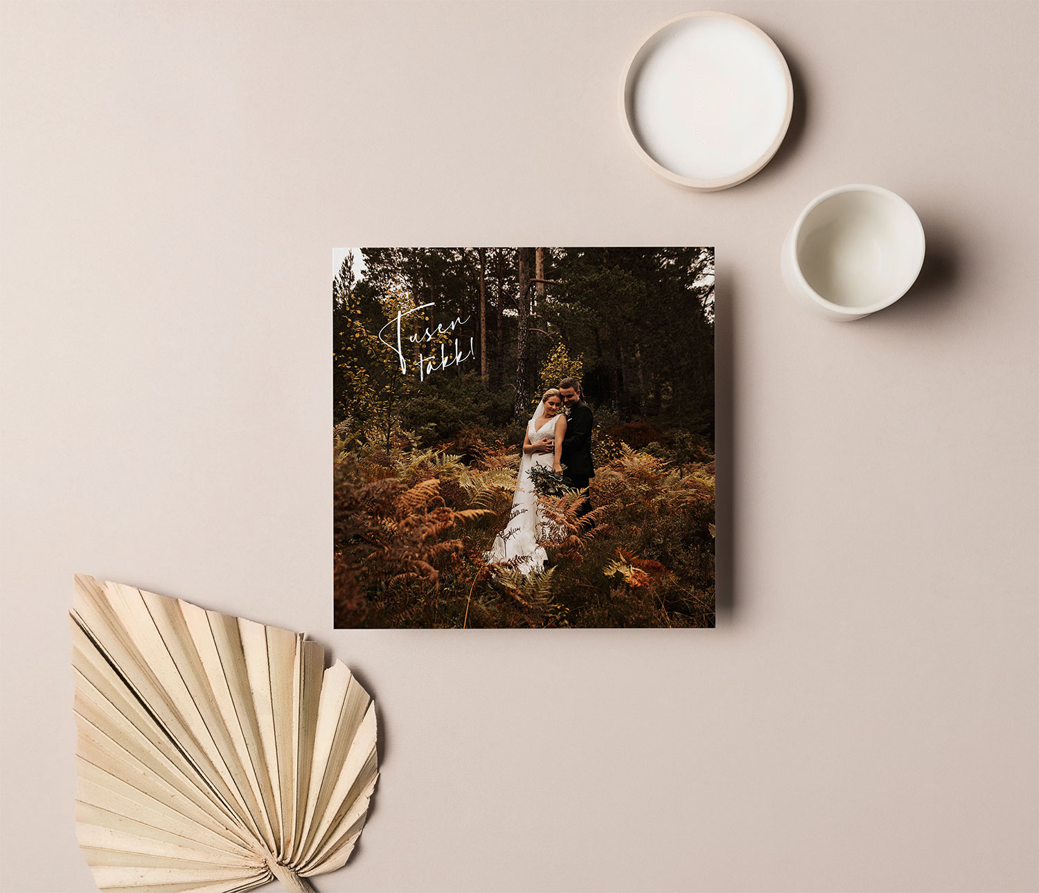 Dobbelt takkekort til bryllup, 141 x 141 mm. Prisen inkluderer dine personlige bilder og tekst på kortet, og de leveres med hvite premium konvolutter. Kortene trykkes på tykt, silk bestrøket papir som får frem bildekvaliteten godt, mens innsiden er halvblank.