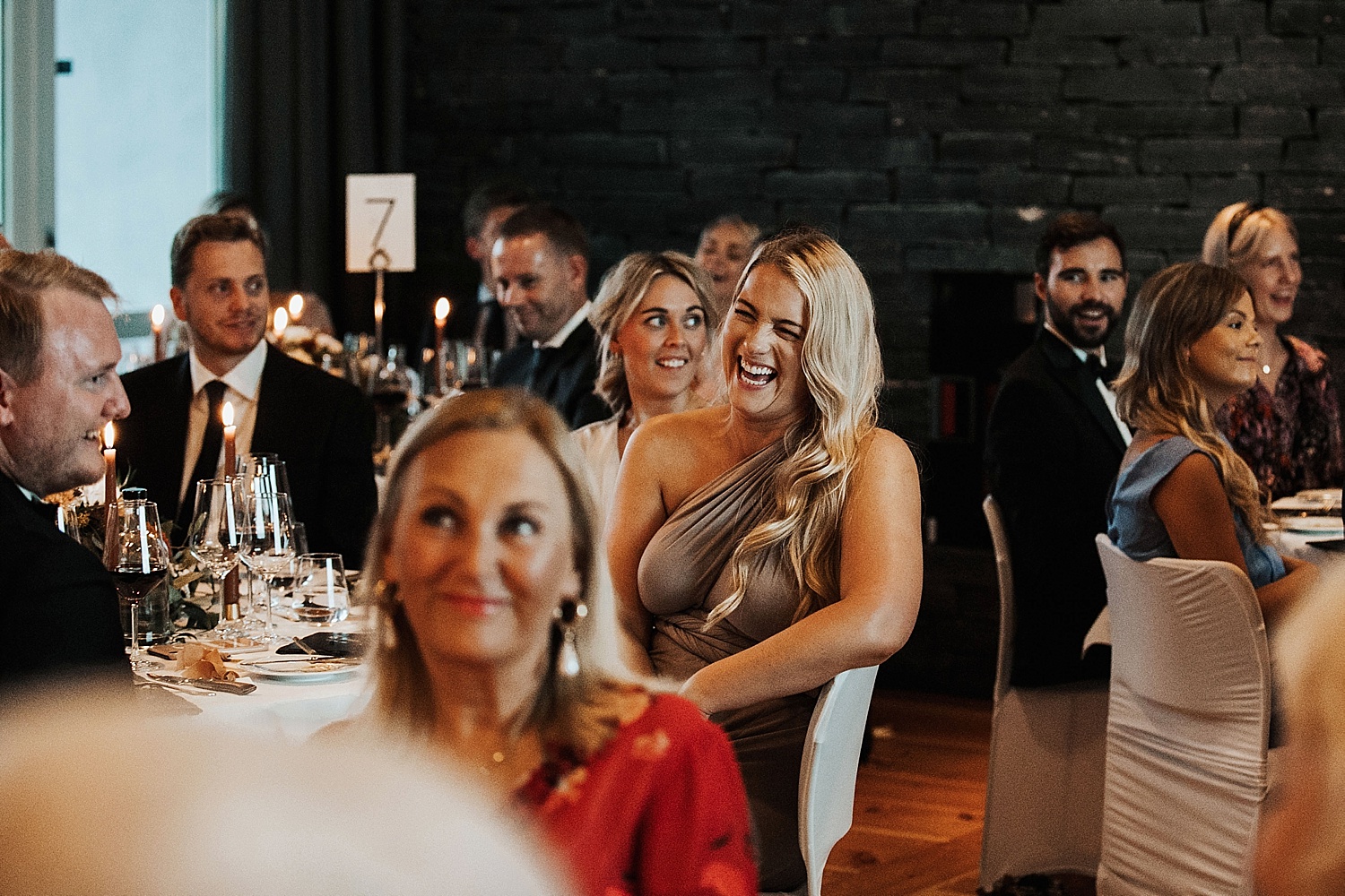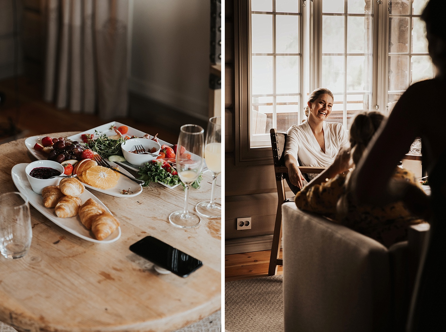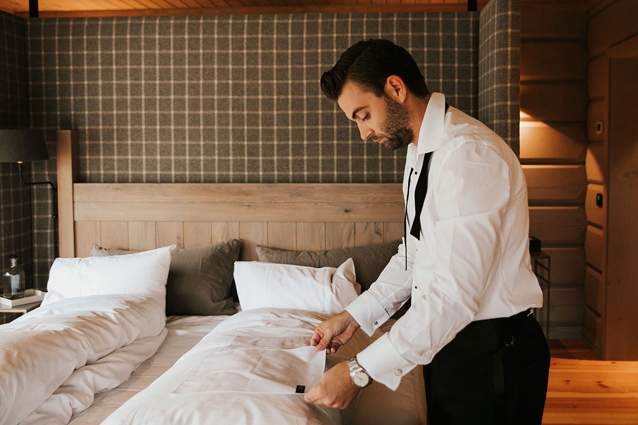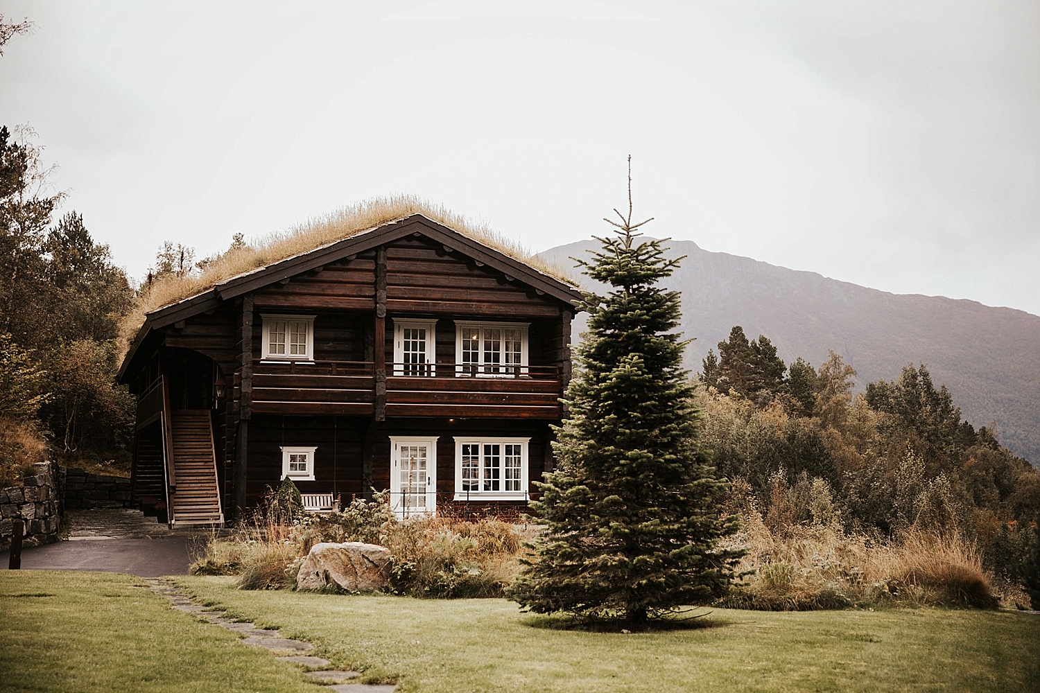 Storfjord Hotel har en helt egen atmosfære som vi umiddelbart følte på første gang vi var innom. Hotellet ligger tilbaketrukket inne i skogen med nydelig utsikt over Storfjorden. I tillegg til at beliggenheten er flott er hotellet nydelig innredet noe som skaper den perfekte stemningen for avslapping og ro uansett om det er sol eller regn. I og med at været på Sunnmøre er ganske ustabilt var det viktig for oss at dagen like fint kunne tilbringes ute som inne. Vi ville at alle gjestene skulle bo sammen med oss bryllupshelgen og Storfjord Hotel var stort nok for å få plass til alle, men lite nok til at det bare var oss – de perfekte rammene for bryllupet vi ønsket oss. Vi er begge glade i god mat og setter ekstra stor pris på at hotellet har fokus på gode, lokale og kortreiste matvarer.